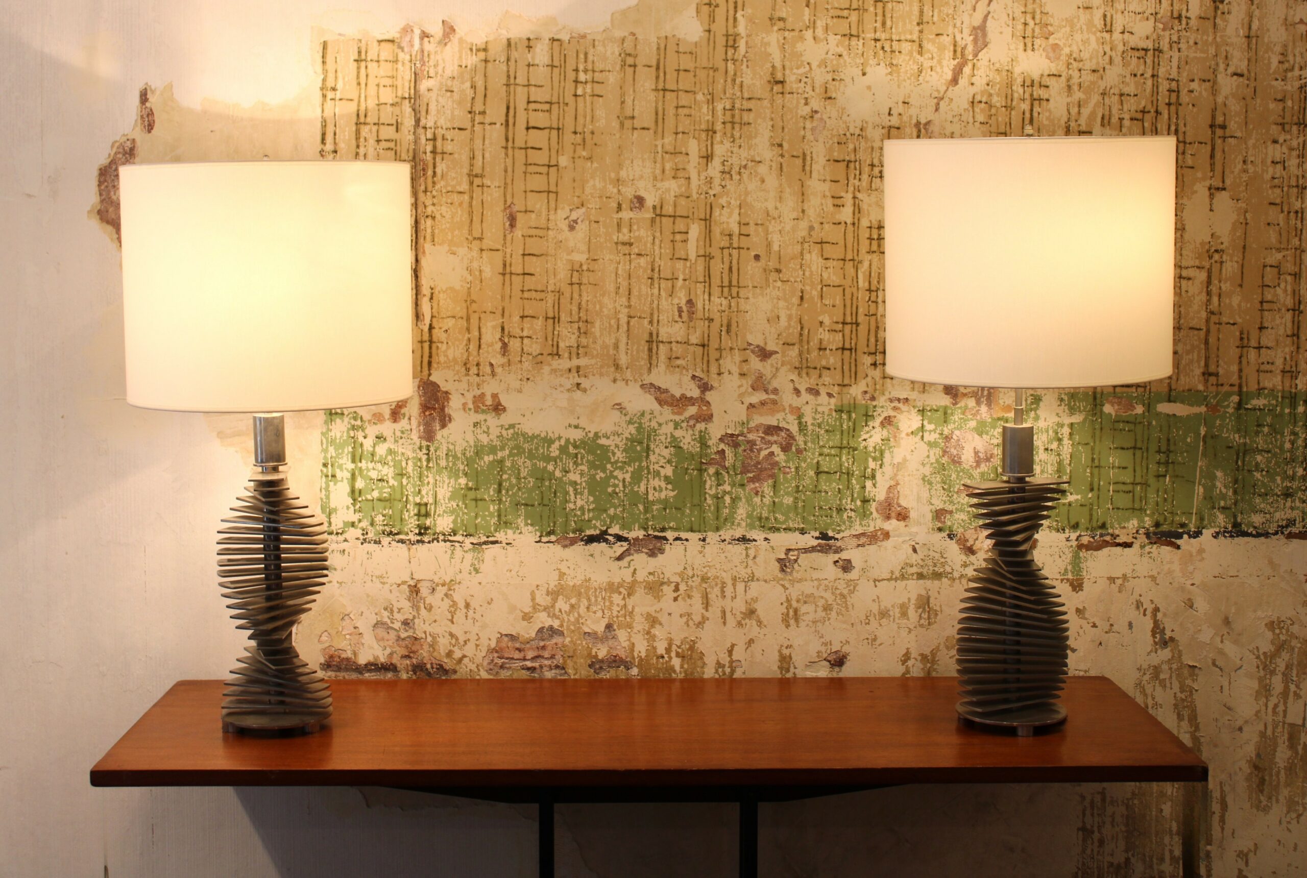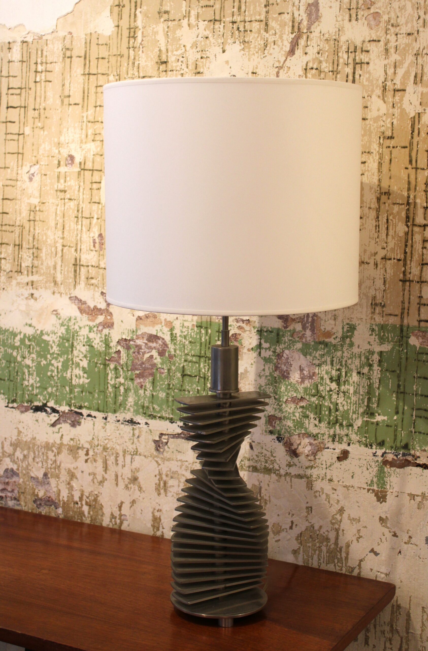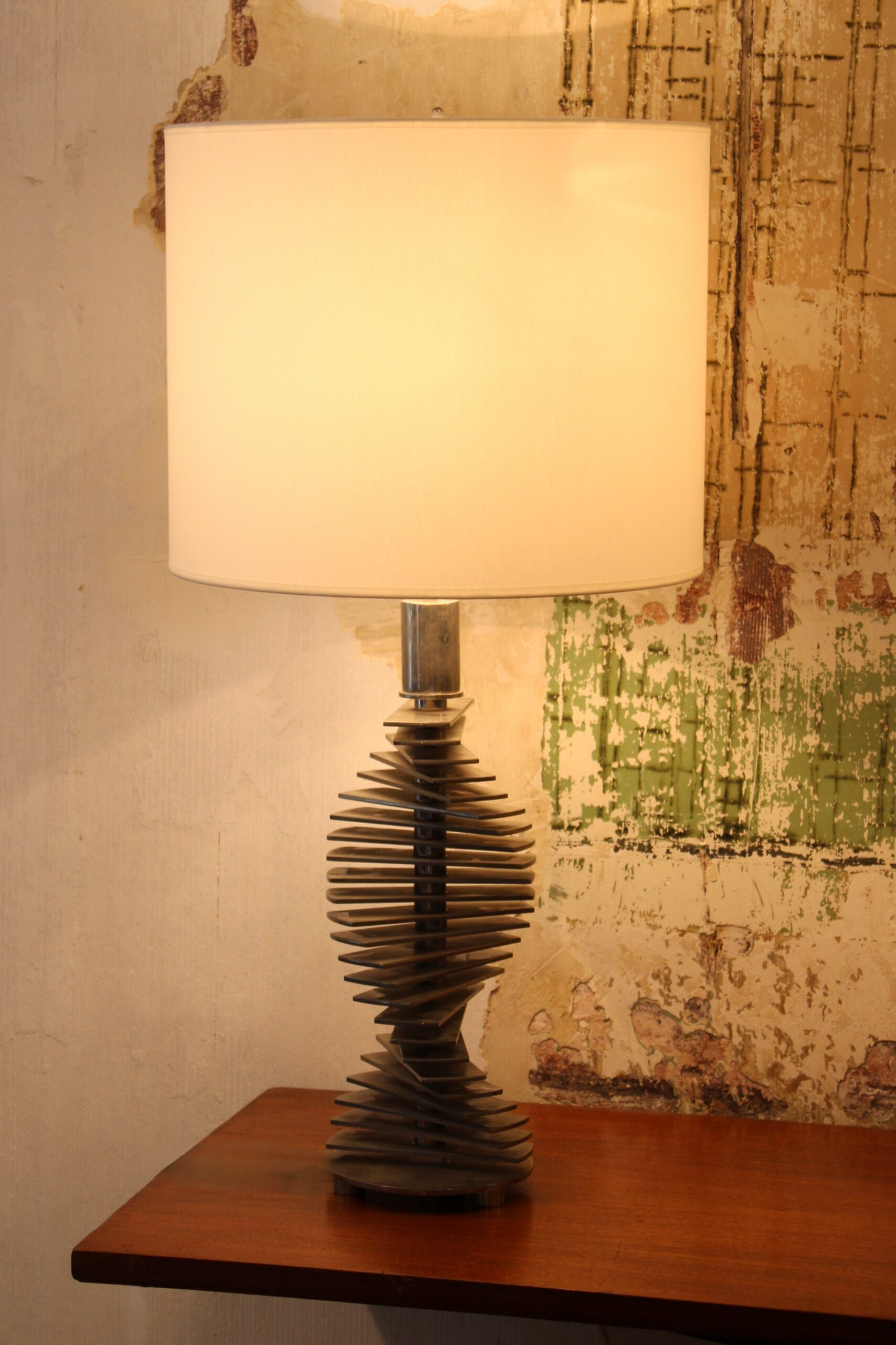 Paire de lampes sculpturales de forme hélicoïdale composées de plaques métalliques mobiles.