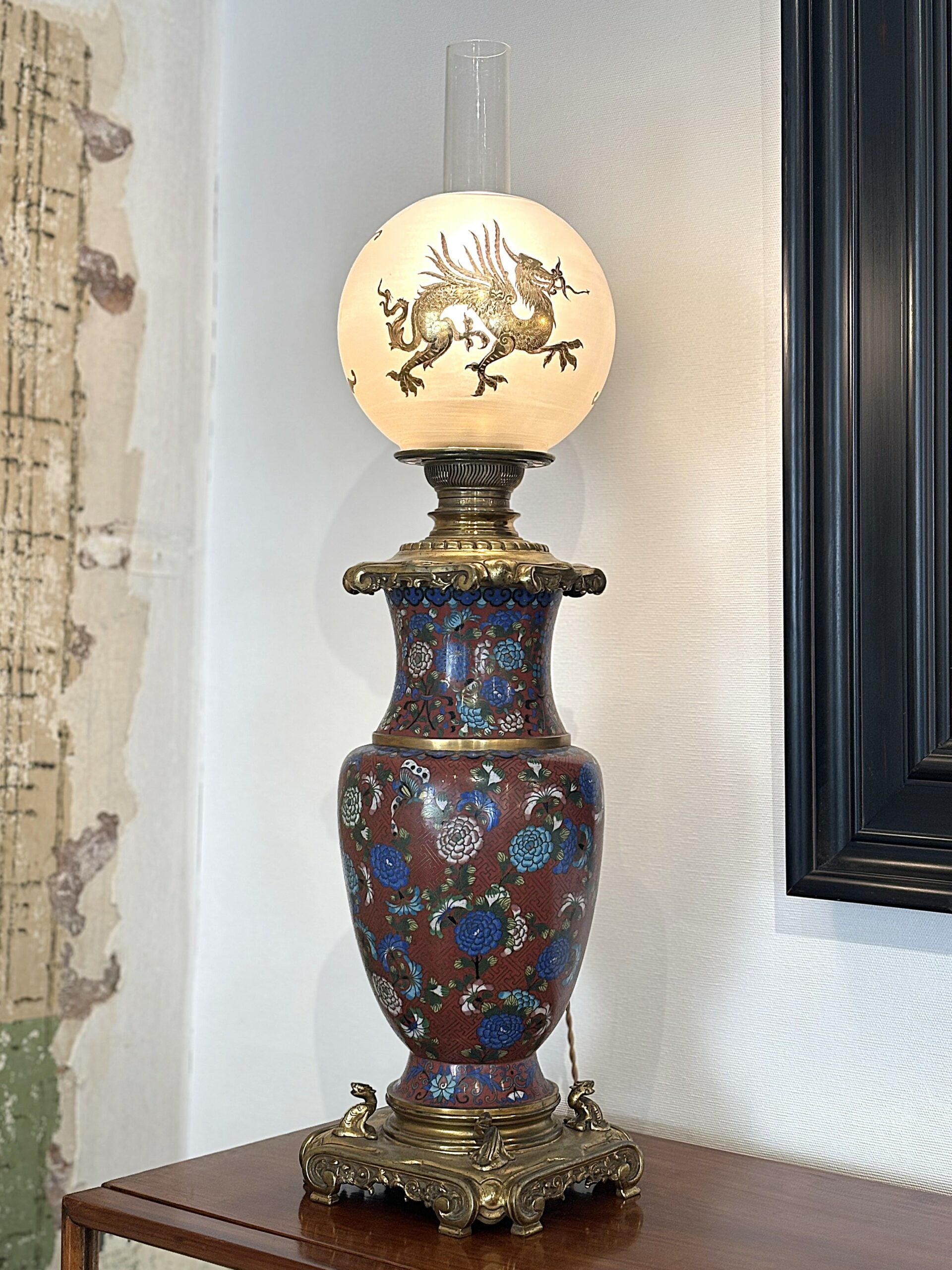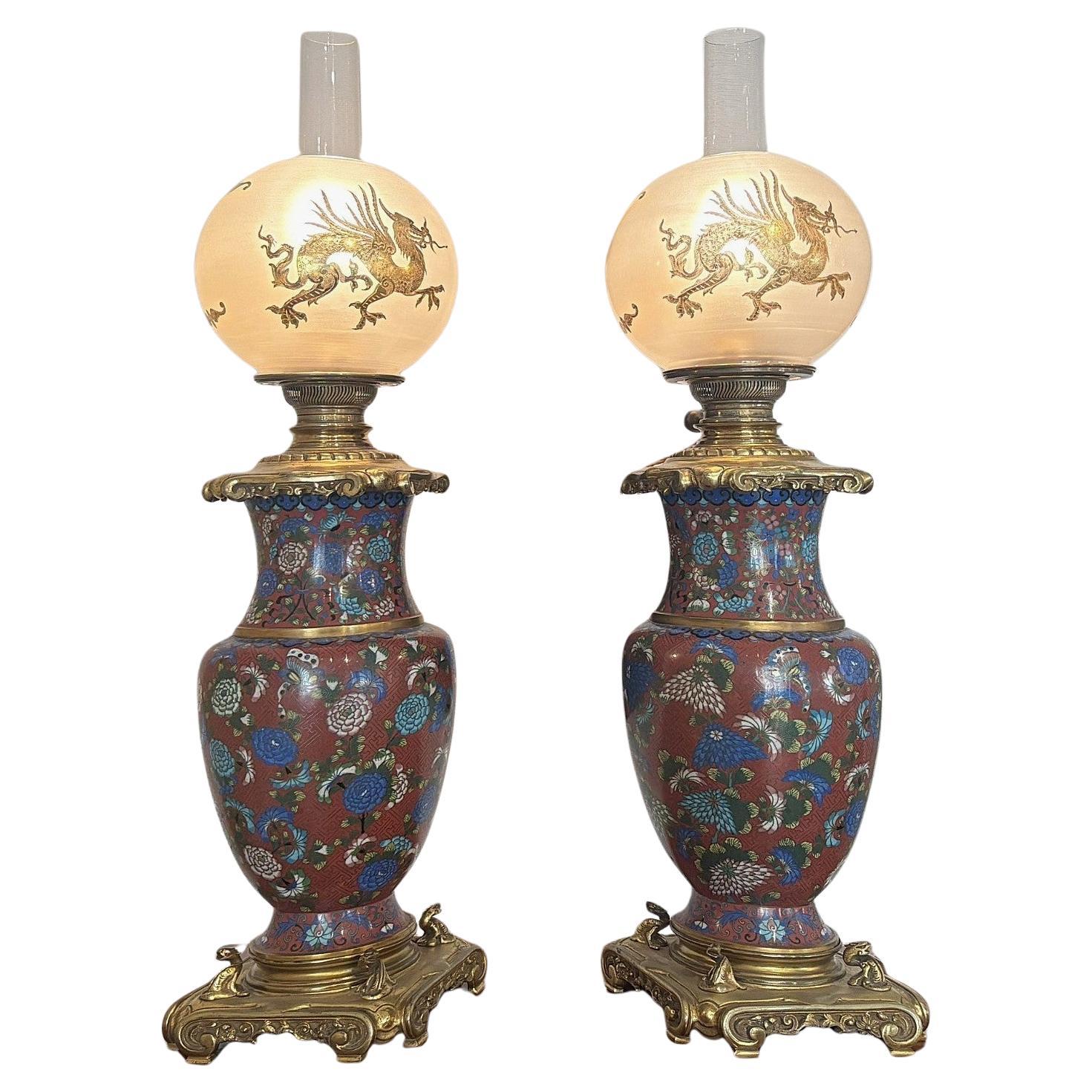 Paire de lampes à pétroles en émaux cloisonnés à décor de fleurs et de papillons, XIXème siècle.